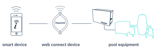 First, your equipment is wired to an AquaLink control center, which is installed at your equipment pad. Then an iAquaLink 2.0 Web Connect Device is connected to the control center.